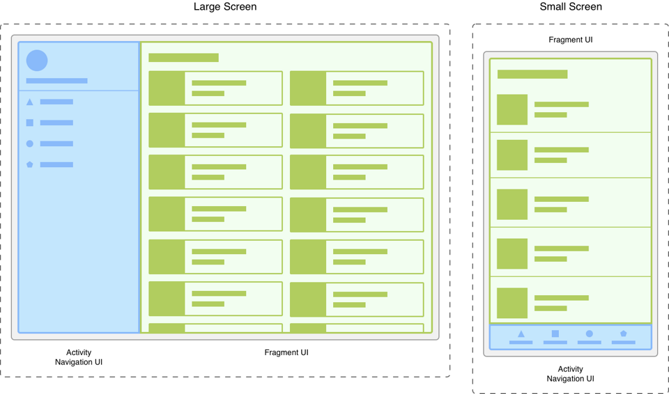 아래 예시에서 왼쪽의 탐색 UI와 오른쪽의 콘텐츠는 각각 별도의 프래그먼트에 포함된다.